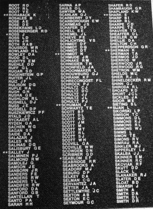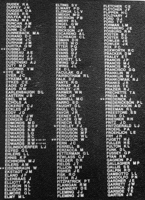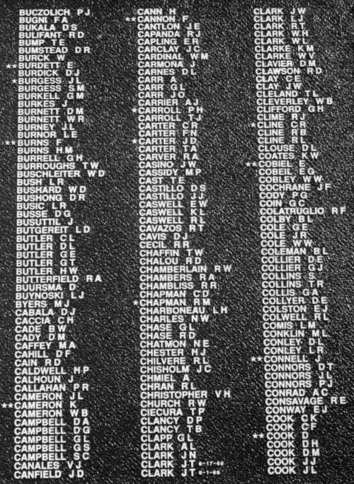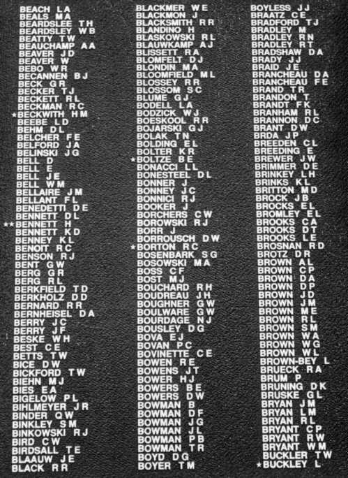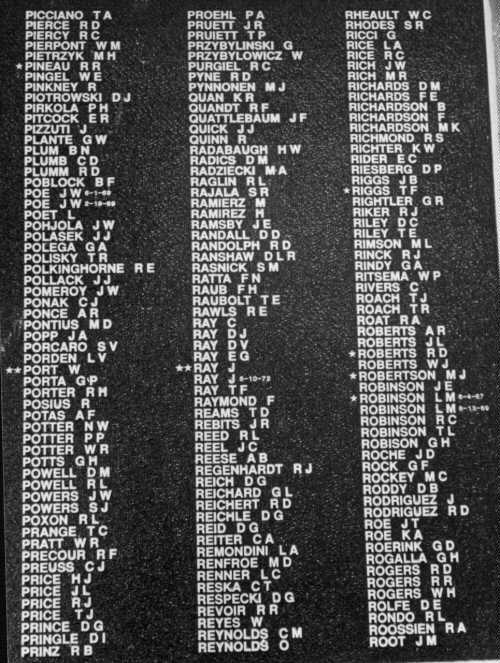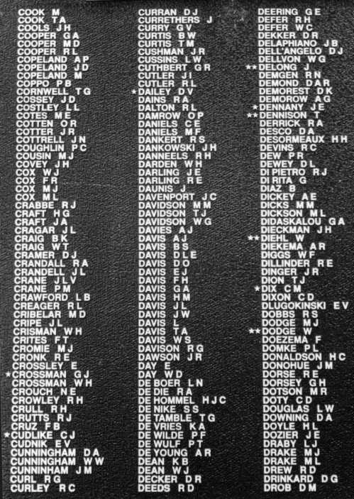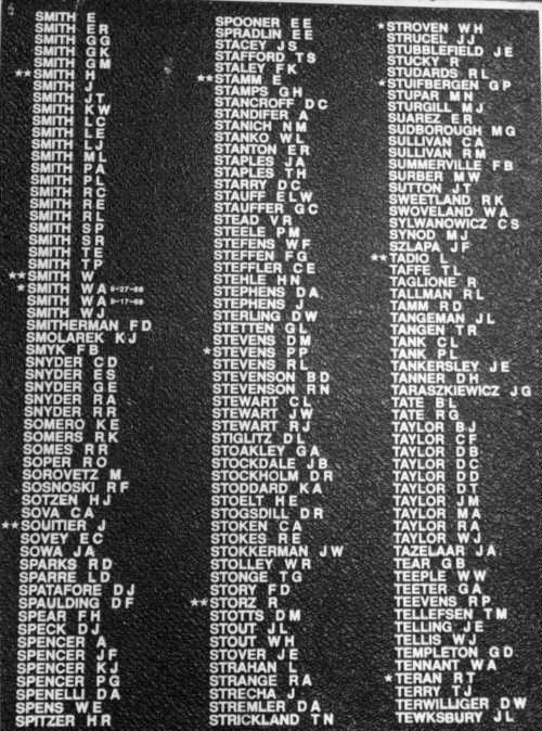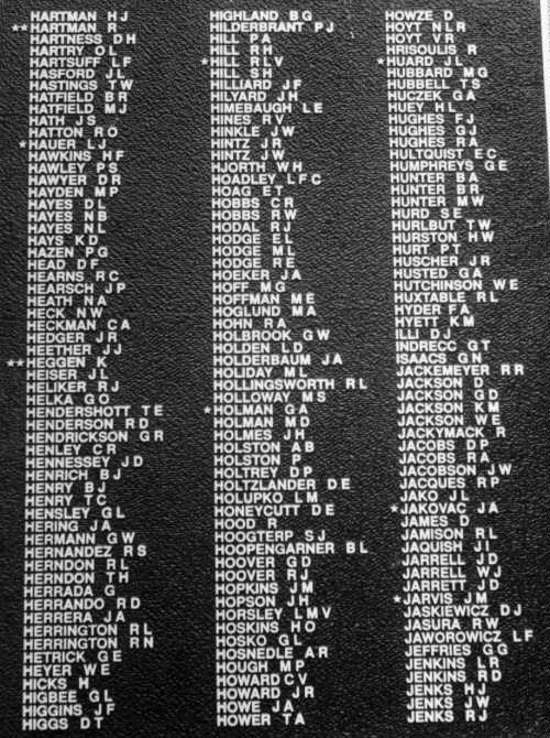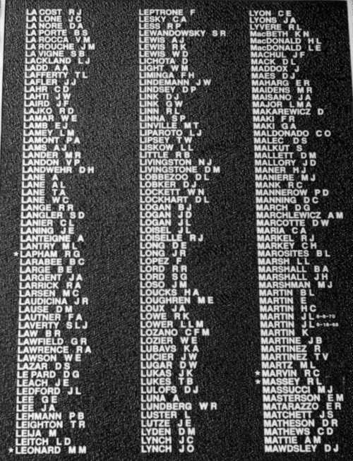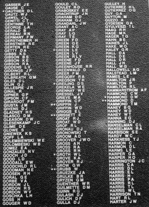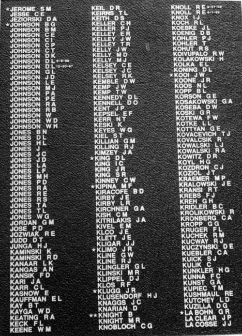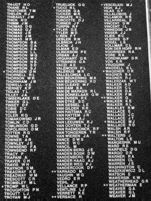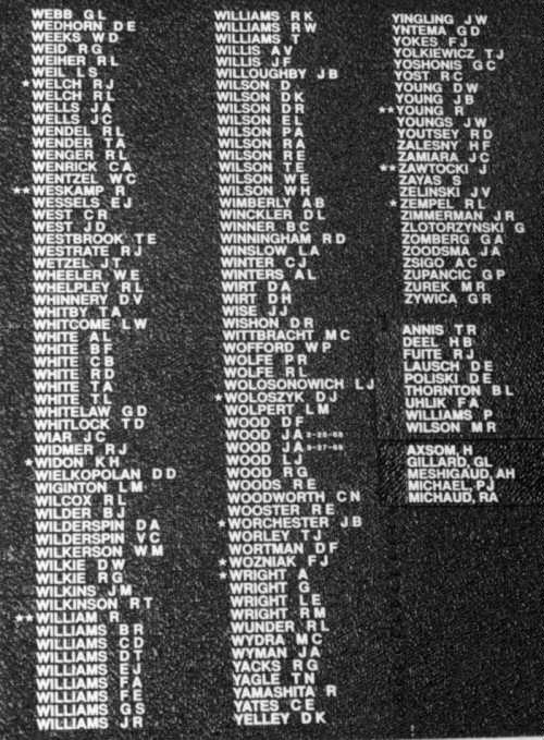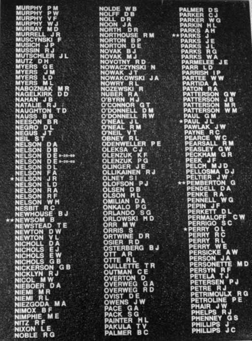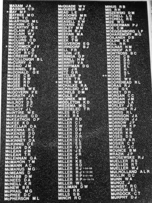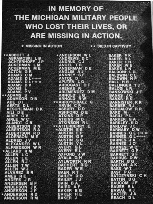 Here, the complete Wall of Names, in 15 different panels, as it appears on the Memorial in Island Park, Mt. Pleasant, Michigan. Click on the first image to see the collection. Plaque #15 includes additional names that were added due to a confusion regarding domicile at time of death. According to Jim Jennings, "Additional names were added to the plaques due to residency mix-ups at time of death. Example: When parents moved out-of-state while soldier was on active duty in Vietnam." Photographs were excavated from Jim Jennings' now defunct website archived on wayback machine, here.
