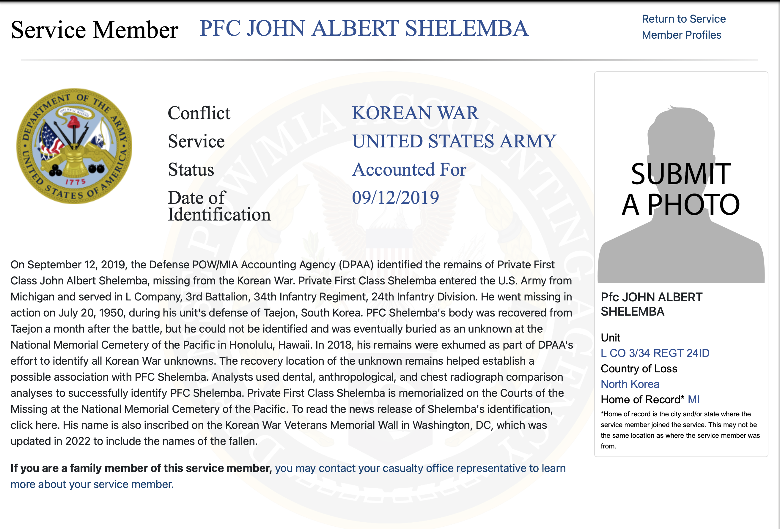 Remains were recovered from Taejon but Pfc Shelemba could not be identified. These remains were buried as an unknown X-251 Taejon at the National Memorial Cemetery of the Pacific in Honolulu, Hawaii. In 2018, these remains were exhumed as part of DPAA’s effort to identify all Korean War unknowns. The recovery location of the unknown's remains helps to establish a possible association with Pfc Shelemba. Analysts used dental, anthropological, and chest radiograph comparison analyses to successfully identify Pfc Shelemba. They also used "circumstantial evidence" which is discussed in the podcast episodes which can be accessed here. On September 13, 2019, the Defense POW/MIA Accounting Agency (DPAA) identified the remains of Pfc John Albert Shelemba.